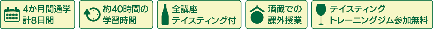 ・4か月間(計8日通学。日曜日開催)かけて、日本酒、焼酎の全てを学習。