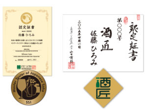 「和酒マスターテイスター」「酒匠」資格取得で付与される、認定証書と認定章。※イメージです。